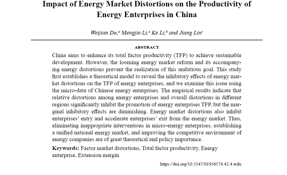 近日,能源经济期刊《Energy Journal》发表山东工商学院乐动网页版一篇财富管理研究论文,标题为“Impact of Energy Market Distortions on the Productivity ofEnergy Enterprises in China”。乐动网页版杜威剑教授为第一作者,学校为第一完成单位。