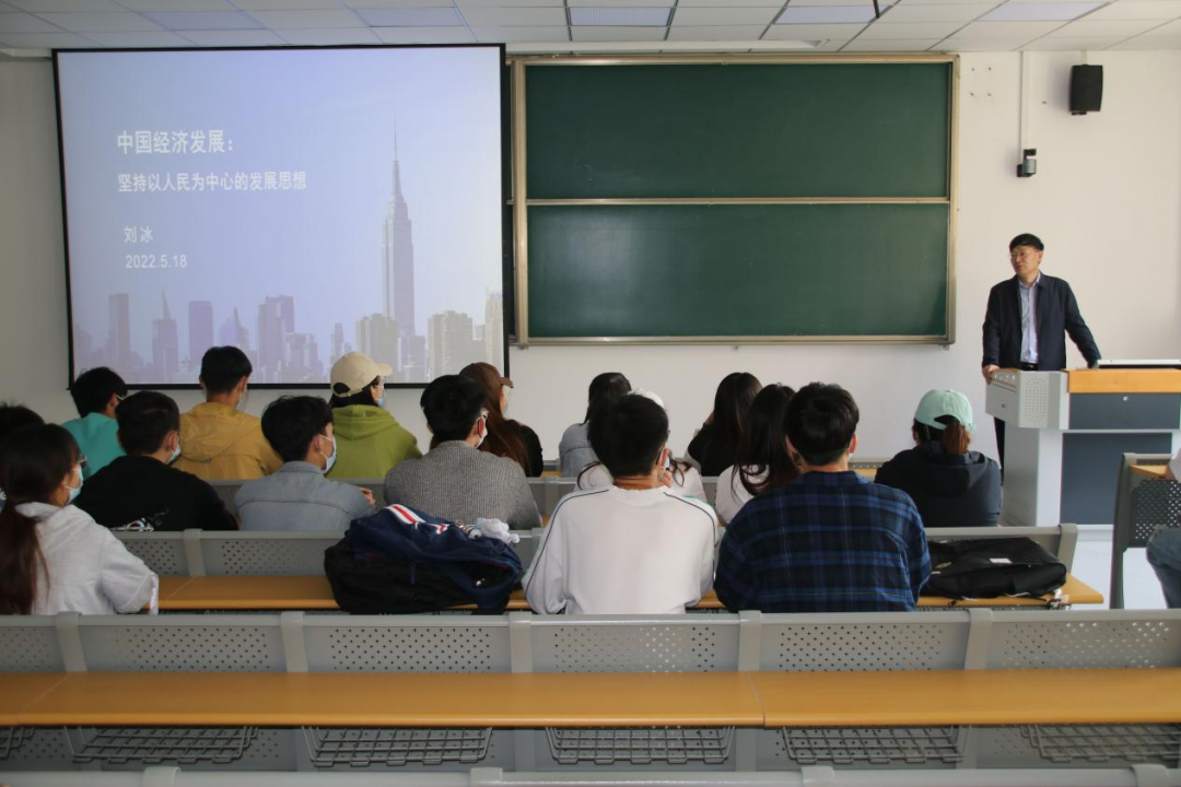 以人民为中心的发展思想是习近平新时代中国特色社会主义思想的重要内容。刘冰以习近平总书记关于中国经济发展的重要论述以及党中央相关会议精神为指引,对以人民为中心的新发展理念做了精准分析和阐述。讲座内容围绕三个方面来展开:一是在世界格局下,全面阐释中国经济发展规律、特点以及现状;二是在中国共产党成立100周年之际,如何准确理解小康社会全面建成的意义;三是共同富裕的内涵、意义和实现途径。刘冰表示,深入学习和研究习近平新时代中国特色社会主义经济思想,是当前经济学专业教育学习的重大任务和重要内容。同时,鼓励学生深刻认识经济学面临的时代课题和创新发展的历史机遇,从而更好地明确专业目标、扎根实践、服务人民。
