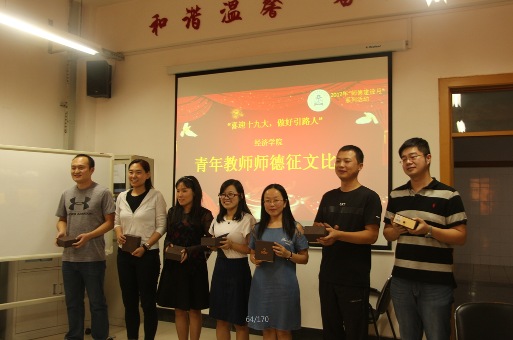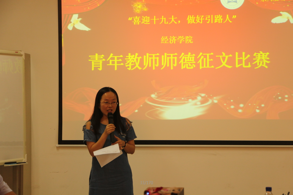 下午两点半,我院“师德建设月”系列活动之“喜迎十九大,做好引路人”青年教师师德征文比赛在五教312室举办。学院部分青年教师参加比赛,学院全体教师前来观看比赛并担任评委。