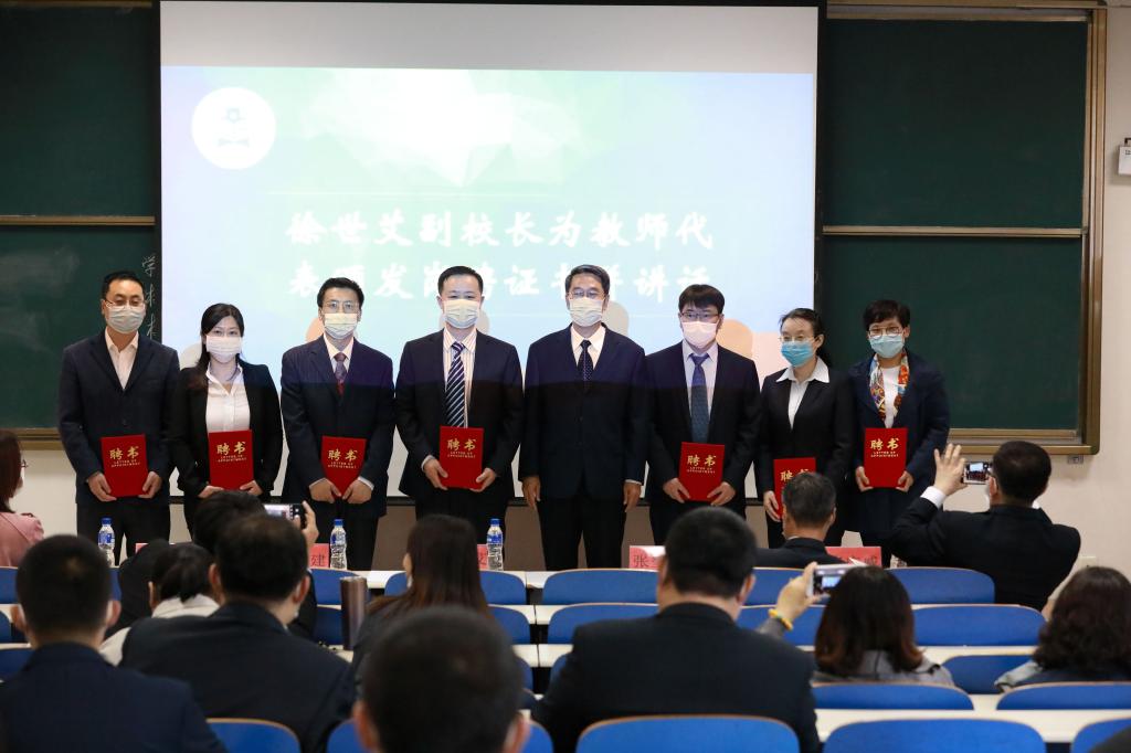 岗聘证书颁发仪式上,党总支书记姜宗建介绍了学院近期工作及第三轮岗位聘用情况。徐世艾副院长为教师代表颁发岗位聘用证书。